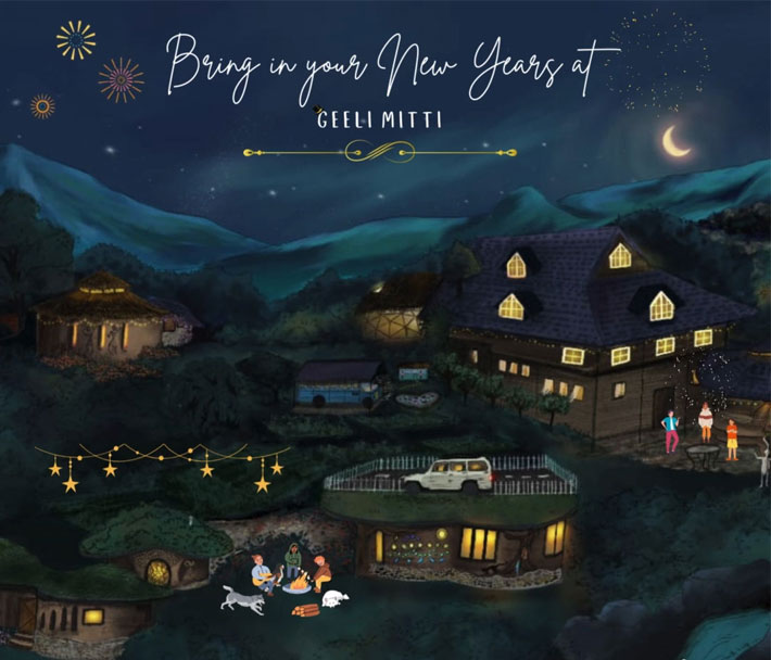Step into the New Year at Geeli Mitti, held in the warmth of community and the quiet magic of the mountains. Nestled within dense temperate oak forests inside the Naina Devi Bird Sanctuary, Geeli Mitti is every nature lover’s dream – idyllic mud cottages, panoramic Himalayan views, crisp mountain air, gurgling freshwater streams, and a vibrant world of flora and fauna. It is a sanctuary where people of all ages and backgrounds come to slow down, learn, and reconnect with the rhythms of nature.